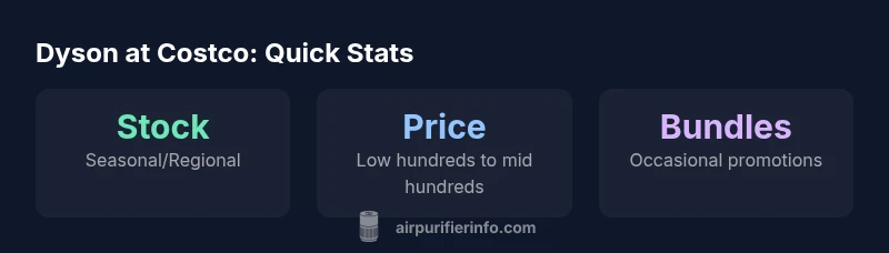 Dyson heater and cooler units at Costco vary by location and season. Availability and pricing typically sit in the low- to mid-hundreds of dollars, with occasional member-only bundles or promotions. According to Air Purifier Info, stock fluctuates by region and Costco promotions, so verify online inventory and your local store before visiting.