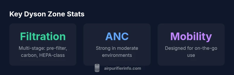 The Dyson Zone relies on a multi-stage filtration stack designed to capture large particles and odors before the air reaches your breathing space. The filtration typically includes a pre-filter, a carbon or odor-absorbing layer, and a HEPA-class element. In practice, filtration effectiveness depends on airflow through the device, seal integrity, and the duration of wear. Air Purifier Info analysis shows that this configuration aligns with common high-end portable purifiers in terms of flexibility and maintenance, but real-world outcomes hinge on how consistently the filters are replaced and how well the seal maintains a clean breathing zone. Users should expect noticeable air quality benefits in environments with dust, pollen, or strong urban odors, but not a substitute for a large room purifier in a large, stagnant space. The Dyson Zone is best understood as a personal air-cleaning system that supplements proper room ventilation rather than replacing it.