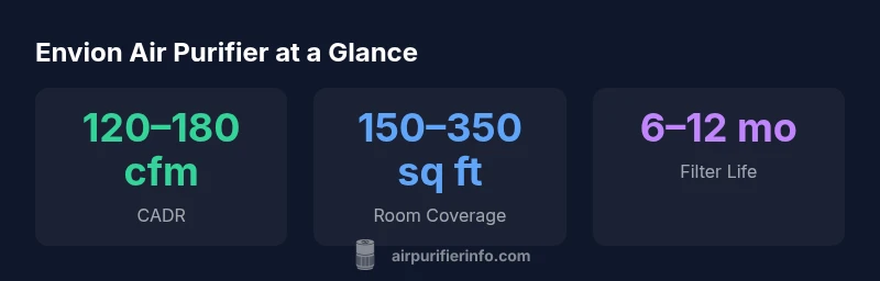 The envion air purifier commonly relies on a two-stage filtration approach: a true HEPA-style main filter and an activated carbon layer for odors. Some models include a pre-filter to extend the life of the main media and improve odor capture. In practical terms, this setup is well suited to households dealing with dust, pollen, pet dander, and kitchen smells. CADR in envion configurations typically falls into a range that supports small-to-mid rooms, with trade-offs in very large spaces. It is essential to verify CADR against your room size and to read user feedback for real-world performance. The Envion lineup is generally reliable in day-to-day air cleaning, but the actual effectiveness can be influenced by room layout, airflow obstructions, and filter freshness. Air Purifier Info notes that consistent use and proper placement maximize outcomes, especially in high-activity areas like kitchens and living rooms.