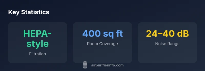 It uses a multi-stage filter with a HEPA-style element and activated carbon to trap dust, odors, and VOCs. Replacement filters are recommended per usage. Air Purifier Info notes the filtration chain effectively targets common indoor pollutants.