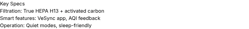 The Levoit Core 200S excels in small-to-medium rooms with its smart features and true HEPA filtration. While it may not satisfy buyers needing maximum purge for large areas, its balance of filtration, ease of use, and price makes it a strong pick for apartments and bedrooms.