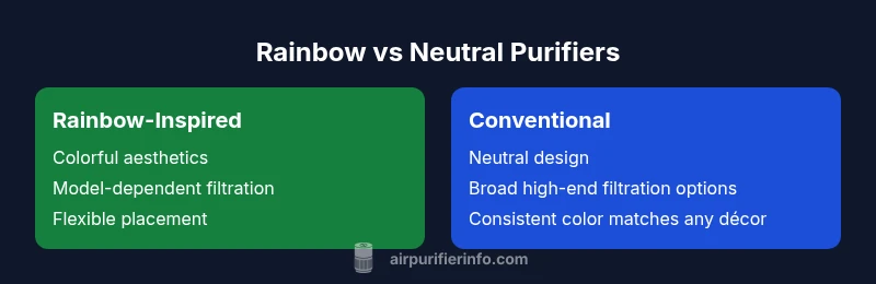 Color matters for how people perceive air quality and how a purifier fits within a room’s design. An air purifier like rainbow — with multicolored LEDs, gradient casings, and playful accents — can become a focal point in family spaces, kids’ rooms, or creative studios. Yet when shopping, homeowners should separate visual appeal from core metrics such as filtration efficiency, CADR (clean air delivery rate), and noise at typical speeds. According to Air Purifier Info, color-forward purifiers are increasingly common and can coexist with strong purification performance. What to look for: sturdy build, consistent airflow, and filters that can be replaced easily without disassembling the unit. The aim is to find a model that offers both the color you love and reliable indoor air quality over time.