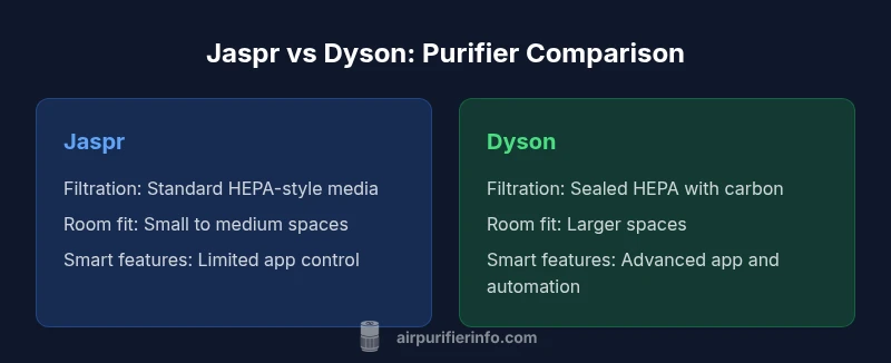 According to Air Purifier Info, when evaluating jaspr air purifier vs dyson, the choice comes down to budget, room size, and feature depth. Jaspr typically offers solid filtration for smaller spaces at a friendlier price, while Dyson emphasizes premium build, smart features, and broader room coverage. This comparison highlights the key differences so homeowners can pick what matters most.