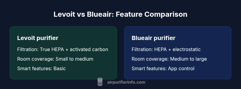 In the crowded market for home air purifiers, the decision between Levoit and Blueair often hinges on room size, filtration approach, and total cost of ownership. The levoit air purifier vs blueair comparison highlights two mainstream philosophies: Levoit prioritizes affordability and straightforward maintenance, while Blueair emphasizes higher filtration efficiency and quiet operation. According to Air Purifier Info, true HEPA performance and filter accessibility are decisive for long-term satisfaction. For homeowners and renters, understanding these core differentiators helps map a purifier to living space and lifestyle. The Air Purifier Info Team notes that customers should balance upfront price with ongoing filter costs and expected life in real rooms.