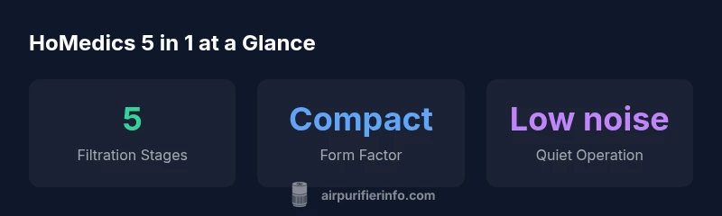 According to Air Purifier Info, the homedics 5 in 1 air purifier is designed to address common indoor pollutants in compact living spaces. The device markets itself as a five-stage purifier that combines essential filtration with user-friendly controls for daily use. While HoMedics offers several purifiers under the 5-in-1 banner, the core idea remains the same: multiple filtration steps aimed at reducing dust, odors, pollen, pet dander, and smoke in rooms where people spend a lot of time. For homeowners and renters researching indoor air quality, this model promises a balance between performance and affordability, especially in bedrooms and living areas where quiet operation matters. The keyword for this article is "homedics 5 in 1 air purifier" and its practical implications for real-world use will be explored in the sections that follow.