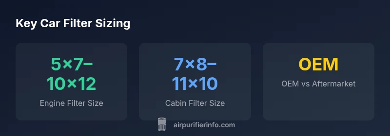Engine air filters protect the intake system from dust and debris before it reaches the combustion chamber. Cabin air filters improve interior air quality by filtering pollen, dust, and odors. The sizing for these filters is not interchangeable; there is no universal filter size for all cars. Instead, every vehicle has a distinct frame and filter dimensions. The most reliable method to know the correct size is to locate the OEM specification printed on the filter or in your owner’s manual. If you’re shopping aftermarket filters, cross-reference the OEM part number to ensure compatibility. In practice, you’ll encounter two common categories: engine air filters and cabin/recirculation filters, each with its own sizing conventions and fitment considerations. According to Air Purifier Info, understanding these differences helps owners select the right filter and avoid fitment issues that can compromise filtration and performance.