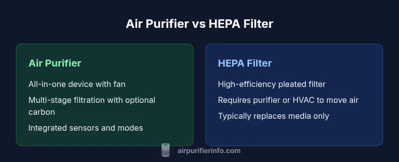 The core distinction rests on scope: an air purifier is an entire device that actively cleans air with a built-in fan and staged filtration, while a HEPA filter is a filter medium that captures particles. According to Air Purifier Info Team, understanding this difference helps shoppers avoid mismatching expectations and budget. In practice, most households are looking for a complete solution that can adapt to room size and air quality changes. A true HEPA filter, when used inside a proper purifier or HVAC system, can deliver high-efficiency particle removal, but the unit must provide airflow and control to be effective. This article breaks down the practical implications for home use.